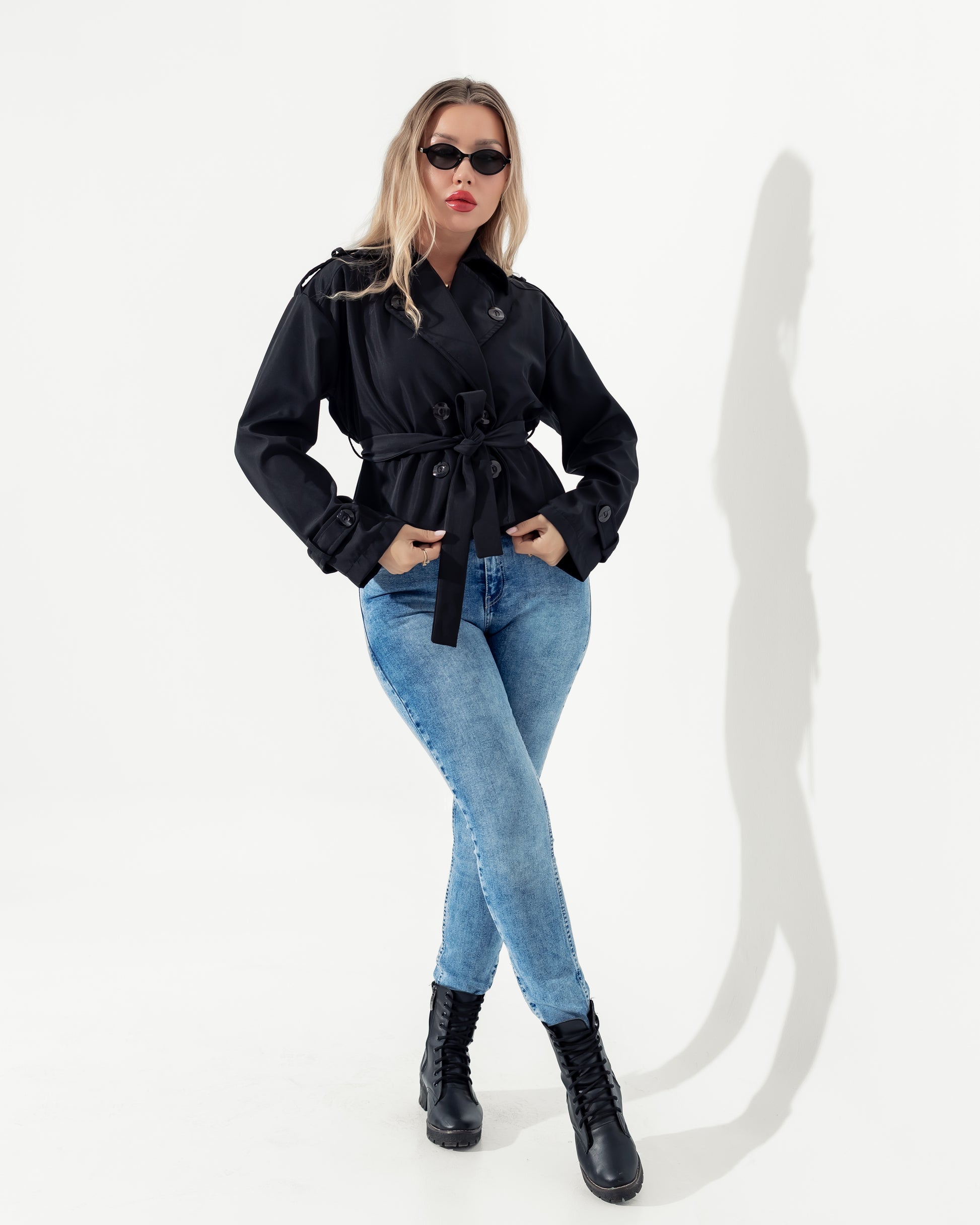 Crafted in a timeless black hue, this jacket boasts a classic trench-inspired silhouette, reimagined into a flattering cropped length. It features a stylish double-breasted front with meticulously placed buttons and an elegant tie belt that not only accentuates the waist for a perfectly adjusted fit but also adds a touch of refined luxury.