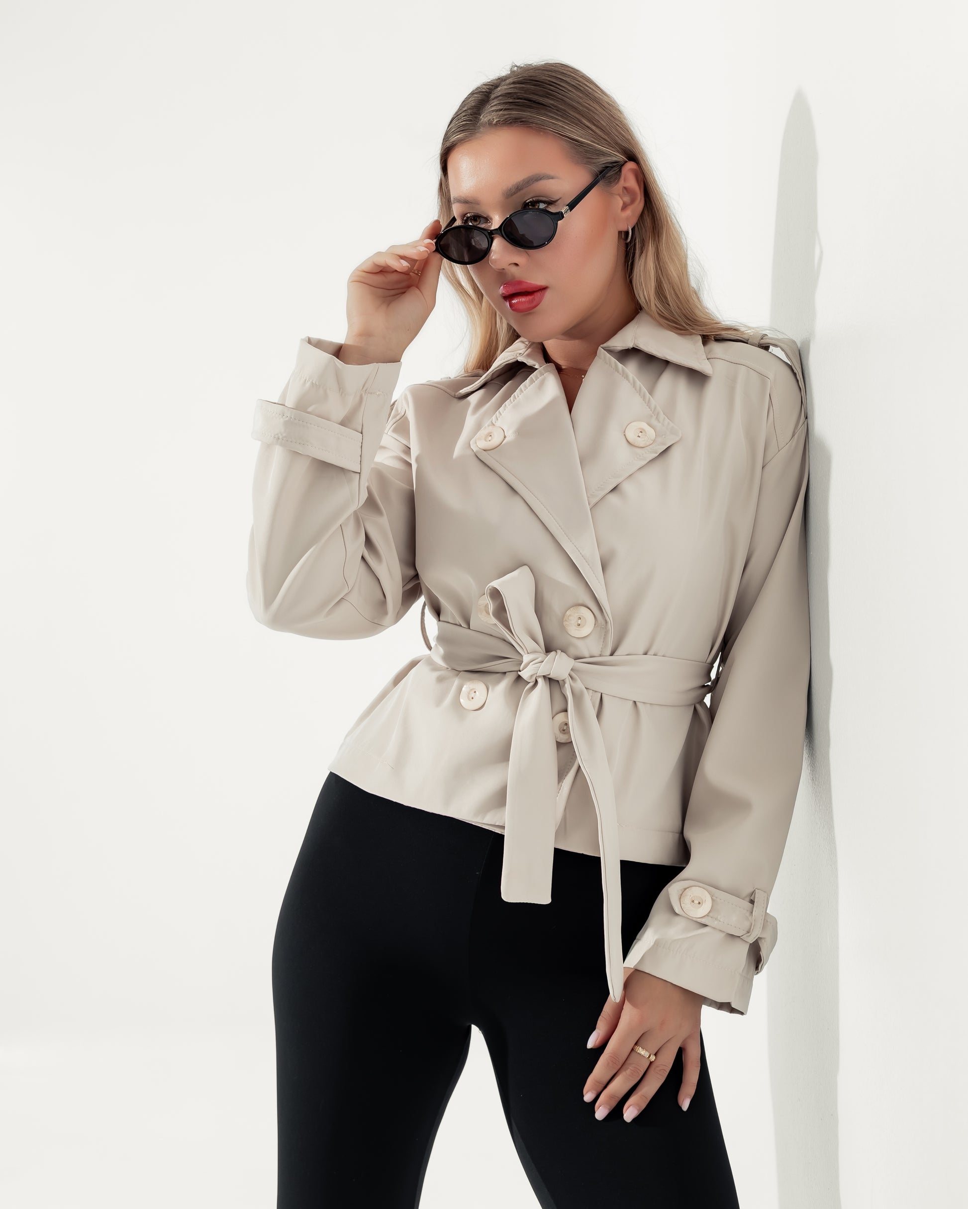 Crafted in a timeless light beige hue, this jacket boasts a classic trench-inspired silhouette, reimagined into a flattering cropped length. It features a stylish double-breasted front with meticulously placed buttons and an elegant tie belt that not only accentuates the waist for a perfectly adjusted fit but also adds a touch of refined luxury.