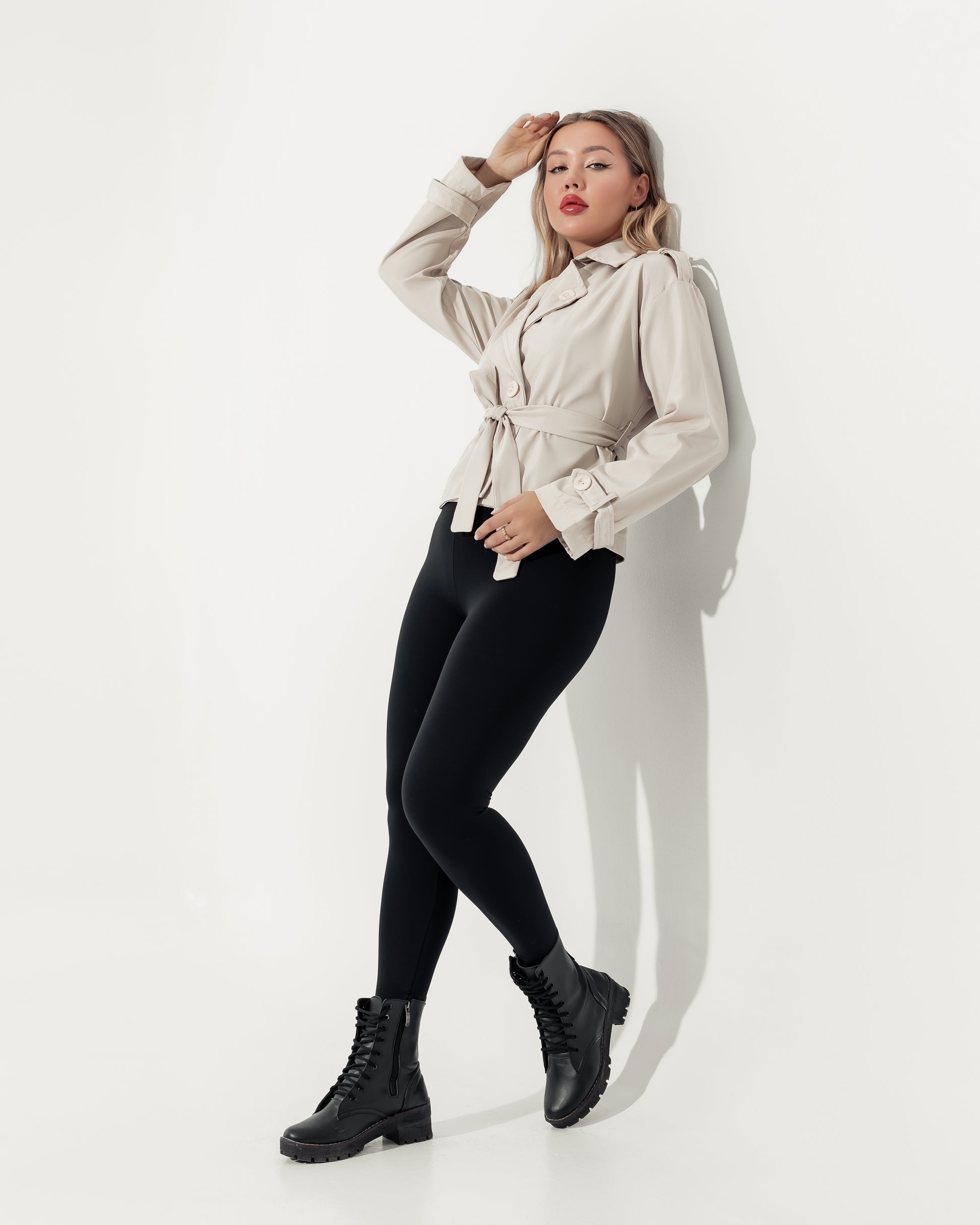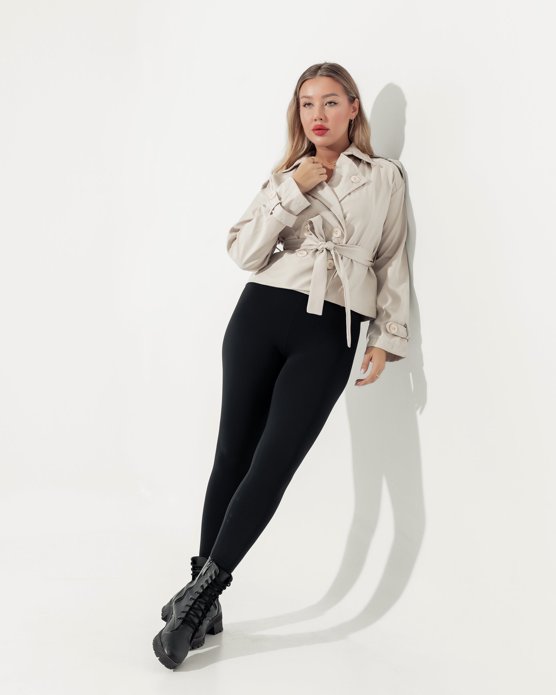 مصنوع باللون البيج الفاتح ، يتميز هذا الجاكيت بقصة مستوحاة من تصميم الترنش الكلاسيكي، ولكن بطول قصير ومميز يبرز جمال القوام. يأتي بصفين من الأزرار الأمامية الأنيقة ورباط خصر فاخر لا يقتصر دوره على تحديد الخصر ليمنحك مقاساً مضبوطاً تماماً، بل يضفي لمسة من الفخامة الراقية.